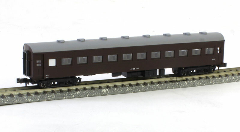 ●オハ35 茶 ●動力無し ●単品車両 ●「きのこ、食パン」と形容された妻板をもつオハ35系戦後形 ●今は懐かしいカラーリングとなった、国鉄旧戦後形客車の標準塗色 ●茶色は原形車両のイメージで木製ドアの形状を採用 ●ブルーは更新車両のイメージでHゴムのついた金属製ドアの形状を採用 ●緩急車(オハフ33)には、点灯式テールライトを標準装備 ●全車両アーノルドカプラー標準装備 ●メーカー:KATO ●商品番号:5127-3 ●スケール:Nゲージ