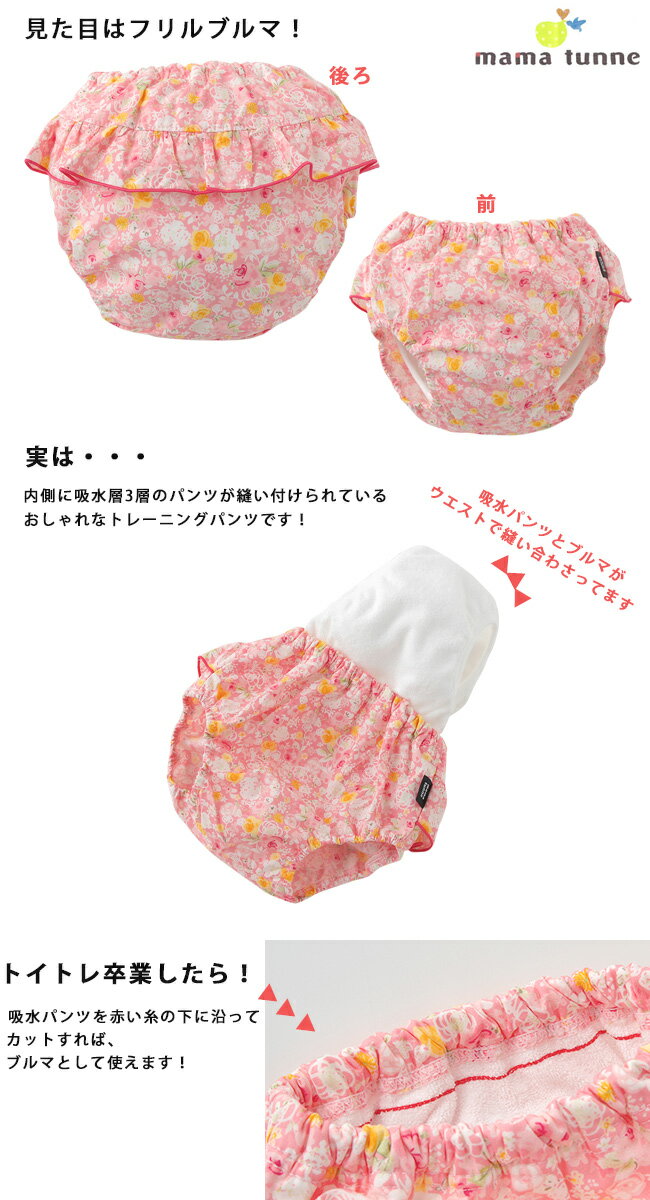 見た目にこだわったフリルブルマ風の とってもオシャレなトレーニングパンツ! トイレトレーニング初期の子におススメな 3層吊り式タイプのトレパンです。